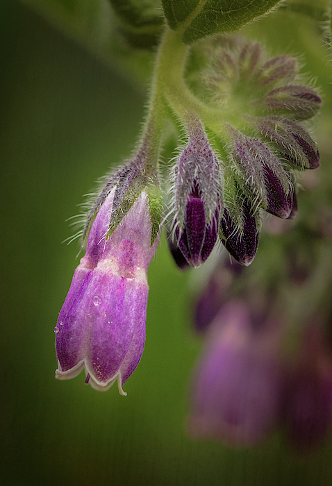 This little flower has survived the rain and still has a couple of water drops clinging to it. The first flower of the bunch has opened while the remaining buds form a spiral while waiting for their turn to bloom. The comfrey plant has a long history as a medicinal plant. Its use has been documented for over 2,000 years. Today it remains an excellent remedy for muscle and joint pain, among other uses.