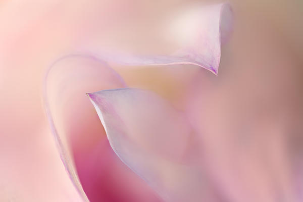 The tip of one flower petal is protected from the front by the arch of another larger petal and from the top by a third petal arching over it. Being protected and secure under the umbrella of others leads to living in a place of security that allows growth through risk taking because you always have that secure base to which you may return. Protected is a macro photograph of dahlia petals using a blending of soft, out of focus areas contrasting with sharpness highlighting just the edge of the petals. This technique focuses the viewer's attention on the repeating design and pattern found within the flower. Mary Jo Allen has specialized in this way of delving deeper into flowers and calls it ColorBlur. Looking deep into a pink and white dahlia blossom reveals gentle, soft layers of petals. This image speaks to the soul of the softness and love that only a flower can bring.